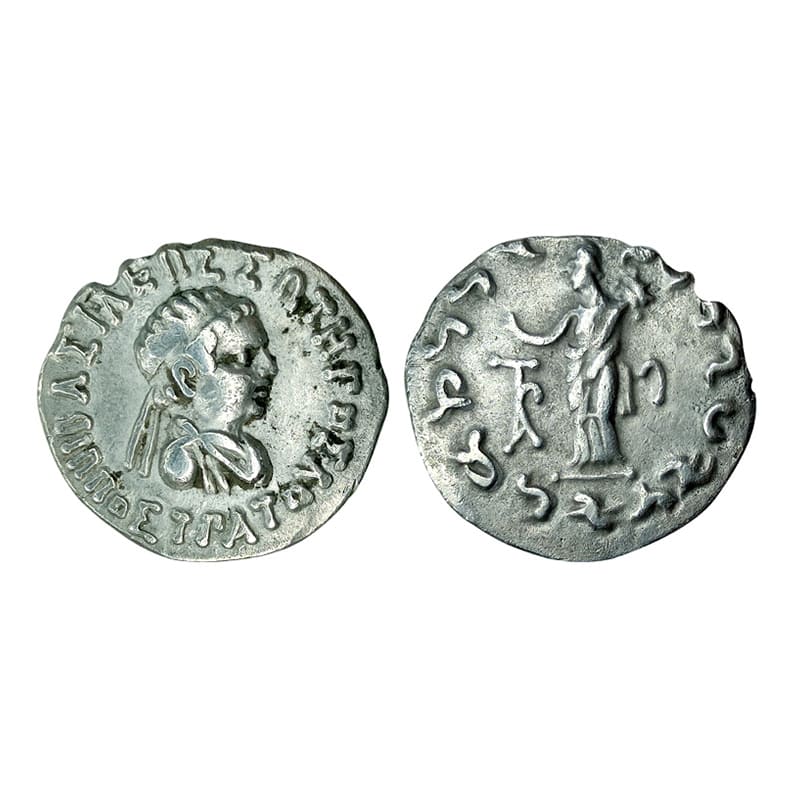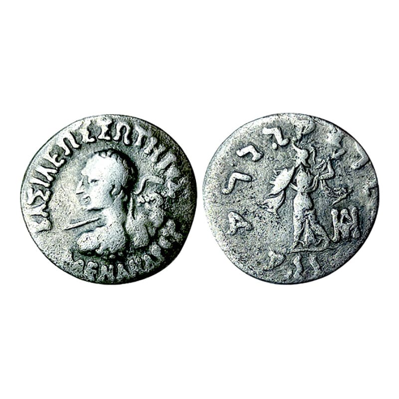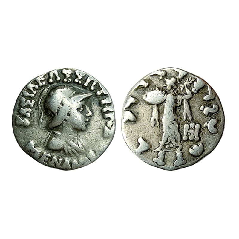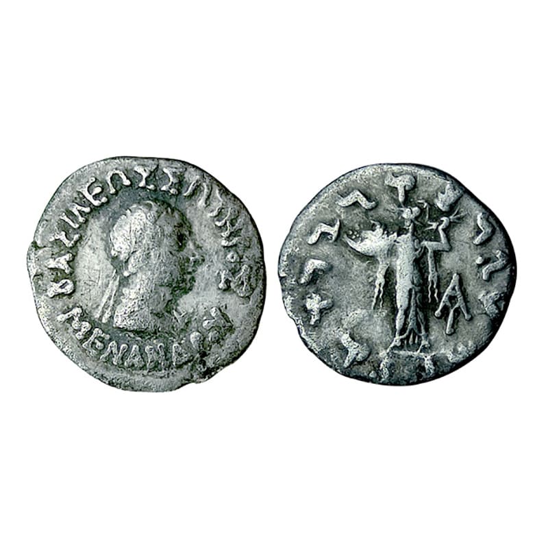 Indo-Greeks, Menander I, Drachm, Silver, 2.36 g, obv. helmeted bust of the king to right with Greek ...